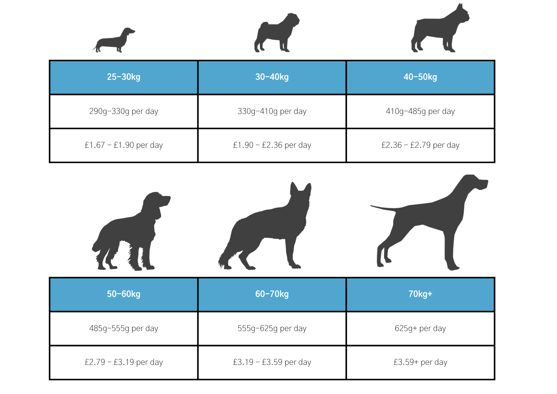 *All dogs are different and the guidelines should be adapted to take into account breed, age, temperament and activity level of the individual dog. When changing foods please introduce gradually over a period of two weeks. Always ensure fresh, clean water is available.